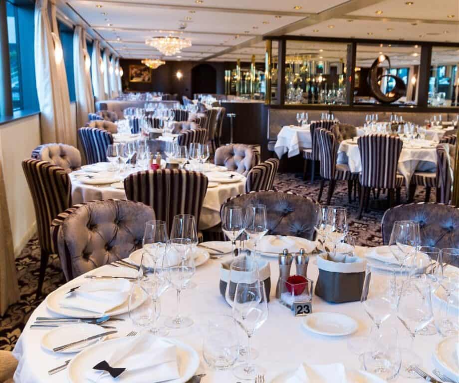 As it’s the first evening everyone dines in the restaurant with a choice of soup, three appetisers, six main courses and three desserts. Selected red, rose and white wines – again all inclusive – reflect our oenophile’s pilgrimage through some of France’s great wine regions: Cote du Rhône, Bordeaux, Burgundy.